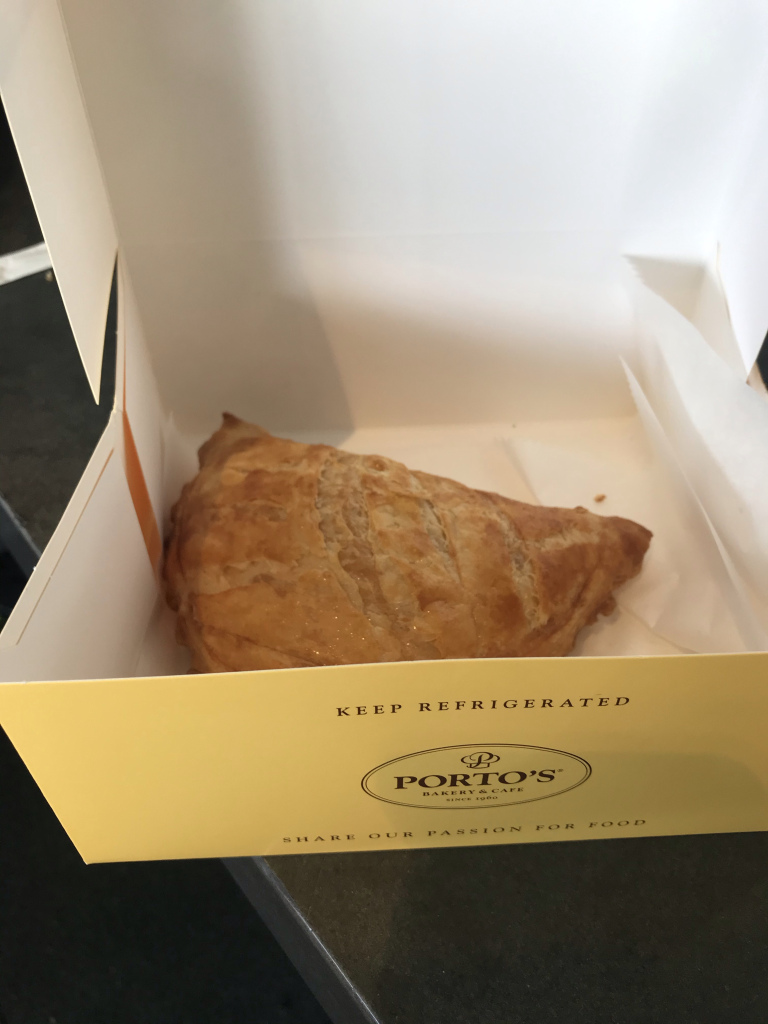 I went to L.A and there was this place called Porto’s. Porto’s is a bakery and cafe which is very popular and delicious. I got the apple turnover and an Italian sub. It’s a good location because it’s right next to Knotts Berry Farm (an amusement park) and you can go to Porto’s after a long day. The apple turnover is delicious it’s like a croissant with apple filling and it’s warm and delicious. The Italian sub is a delicious sandwich with lettuce,cheese,tomatoes it comes with banana chips and I love it.